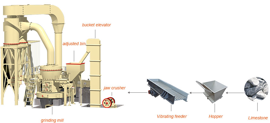 The bulk material is firstly sent to the jaw crusher and crushed into desired granularity. And then material are fed into grinding mill by bucket elevator. The grinded powders, which rise with airflow of fan, are grades by collector.